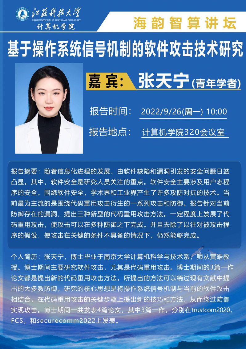 海韵智算讲坛:(张天宁)基于操作系统信号机制的软件攻击技术研究