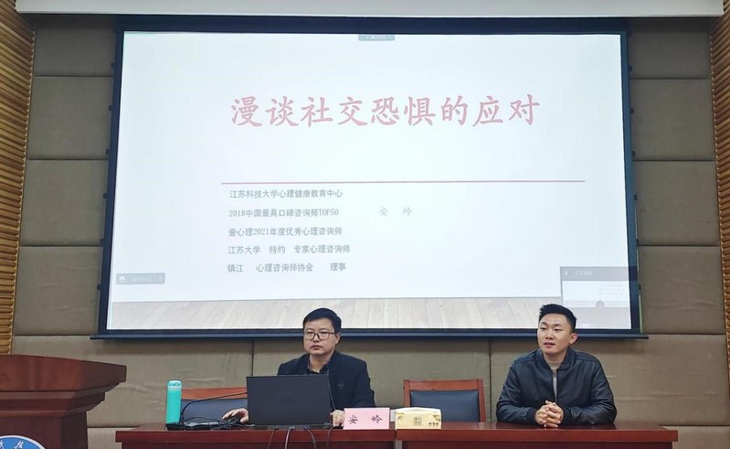 11月4日下午15:30,江苏科技大学心理健康教育中心、米兰体育app,米兰(中国)“心理健康辅导工作室”在图书馆B101开展“向阳携行,共创未来”心理健康教育讲座。本次讲座通过“线上+线下”双平台,邀请校心理健康教育中心专职教师安玲老师进行《漫谈社交恐惧症的应对》主题宣讲,旨在帮助同学们认识到什么是社交恐惧症,正确的认识社交恐惧症,帮助同学们战胜社交恐惧,消除社交紧张,建立良好的人际交往。会议由计算机学院心理辅导员刘宝达老师主持,学院各专业各班级同学近100人参与。会议开始由刘宝达老师简述本次的讲座内容,并且隆重的介绍本次的主讲人安玲老师,大家对安玲老师表示热烈的欢迎。