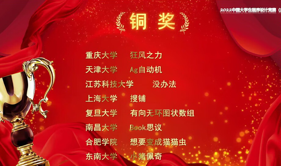 近日,第8届中国大学生程序设计竞赛在哈尔滨工业大学(威海)顺利举行。来自全国161所高校的278支队伍同场竞技,双一流高校悉数参加。江苏科技大学在9月初举行的预赛中从2800多支队伍中脱颖而出,进入全国赛,经过两天智力与体力的激战,面对来自全国包括清华大学、北京大学、复旦大学、上海交通大学、南京大学、浙江大学等在内许多名校计算机顶尖人才,由计算机学院殷苏海、王博、续马乐三位同学组成的队伍在教练景国良老师的带领下戒骄戒躁,勇于拼搏,最终勇夺铜奖。