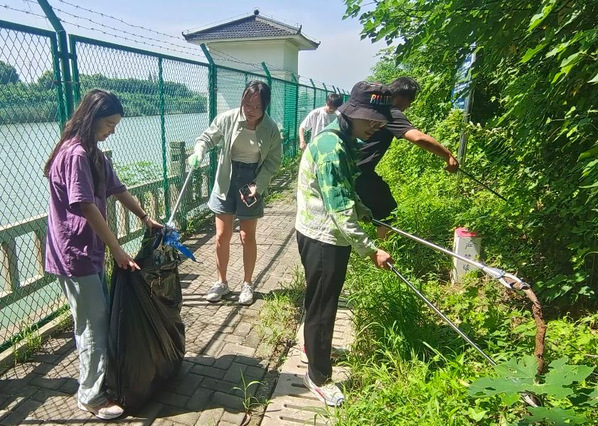 紧接着,金所长与相关工作人员带领着实践团来到河道旁进行河道清理,让实践团切身感受到环境污染的危害。实践团手持铲子、垃圾袋等工具,分工合作,积极开展清理工作。