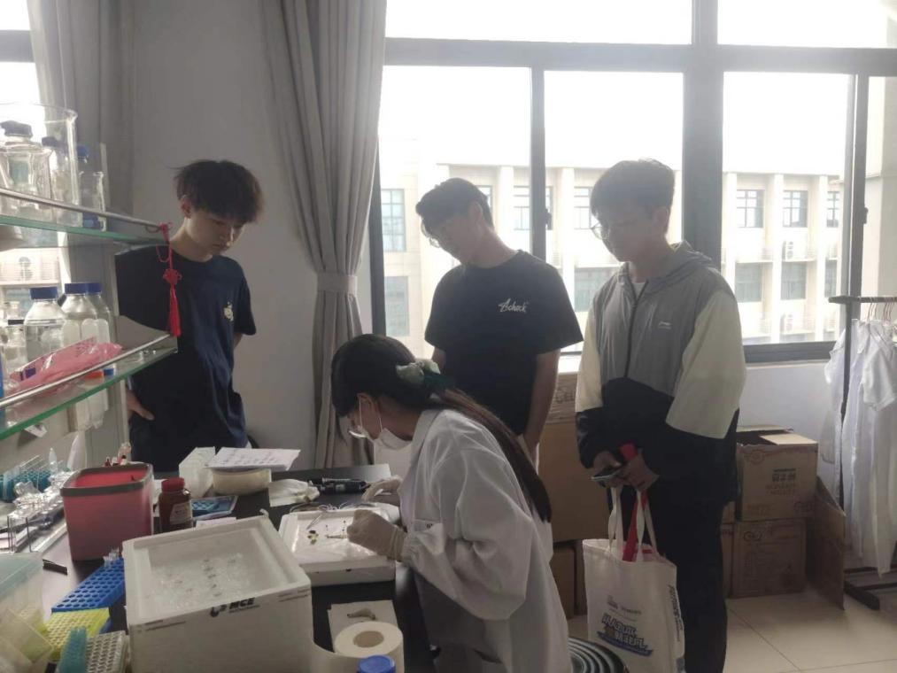 实践队还前往江苏科技大学的生物技术学院,亲身体验了白玉蚕的解剖实验过程。在严谨的实验环境中,实验员耐心地向队员们展示了蚕的内部结构,从表皮到中肠,再到脂肪体。成员刘昱缨感叹:“亲眼见证蚕宝宝从外而内的精妙结构,不仅让我深刻感受到了生命的复杂与奇妙,更体会到了科学研究的严谨与细致。”
