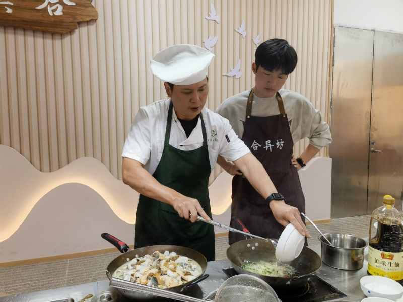 在厨师的指导下,成员们更加自信地投入到烹饪过程中。面对一些复杂的菜肴,如酸菜鱼等,厨师更是手把手教学,每一个步骤都详细讲解,确保每位参与者都能掌握其中的关键点。这种寓教于乐的方式不仅让参与者学到了实际的技能,也增加了活动的趣味性。