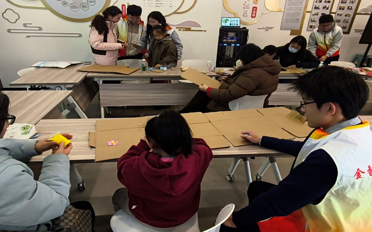 图为江苏科技大学“循环之美”公益服务实践团的同学在金香社区和居民一起手工制作