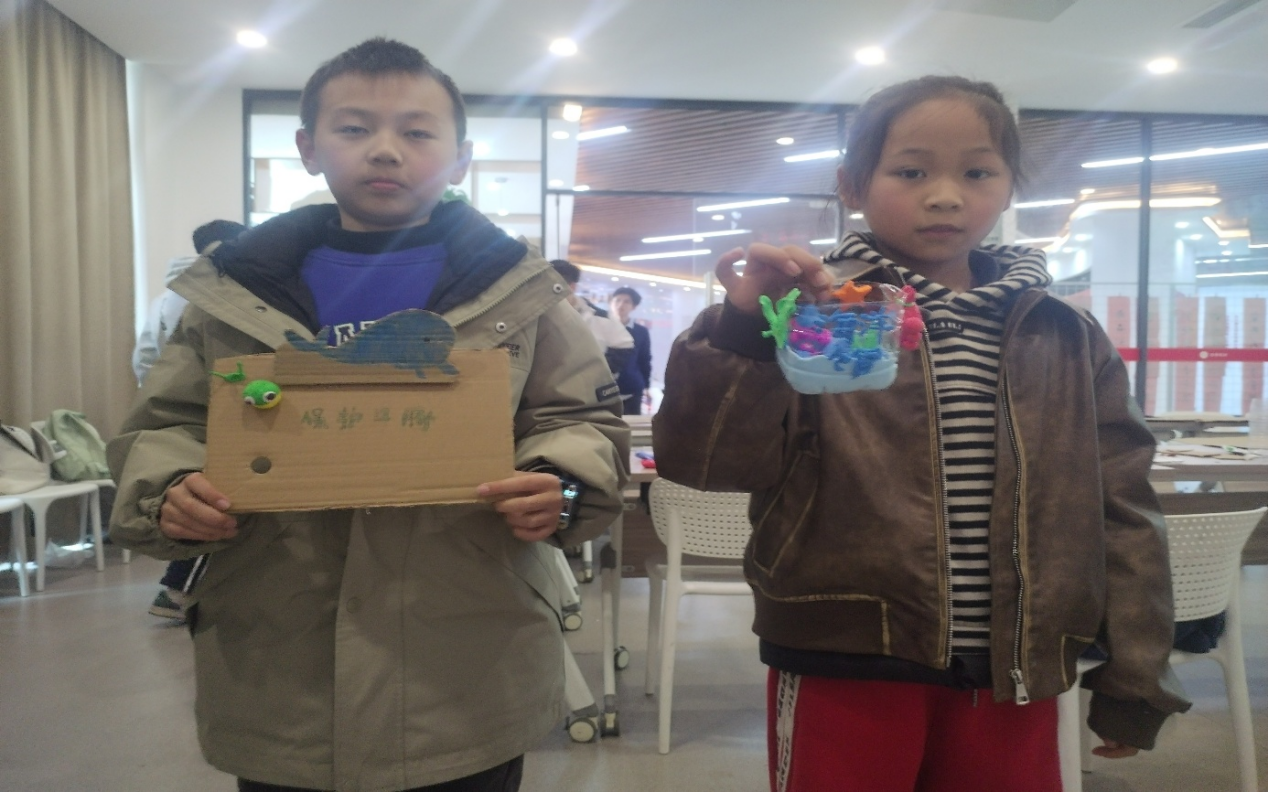 在知识普及环节之后,实践团成员携手社区老中幼居民,共同开展了“变废为宝 - 长江江豚”主题手工实践活动。活动现场,平日里堆放在角落的废弃纸箱、粘土等材料,在大家的巧手下被赋予了新的生命。大人和小孩们热情高涨,创意不断。有的小朋友用粘土精心捏制出可爱的江豚,并模拟出逼真的海洋环境;有的居民则充分发挥自己的创意,拿起废弃的快递纸箱,用彩铅绘出栩栩如生的江豚形象,再巧妙地裁剪下来。活动过程中,大人与小孩积极互动,温馨和谐的氛围洋溢在整个会议室,大家共同体验着循环利用废弃物带来的乐趣与成就感。