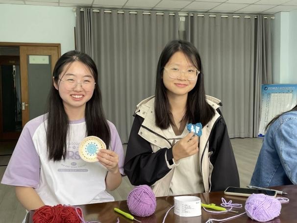 活动能够顺利开展,离不开两位2023级人工智能专业的喻聪聪和余俊贤同学的辛勤付出。她们全程耐心指导,从基础针法的演示到复杂花样的讲解,再到针对同学们遇到的问题逐一解答,其专业与热情为活动增添了许多温暖。