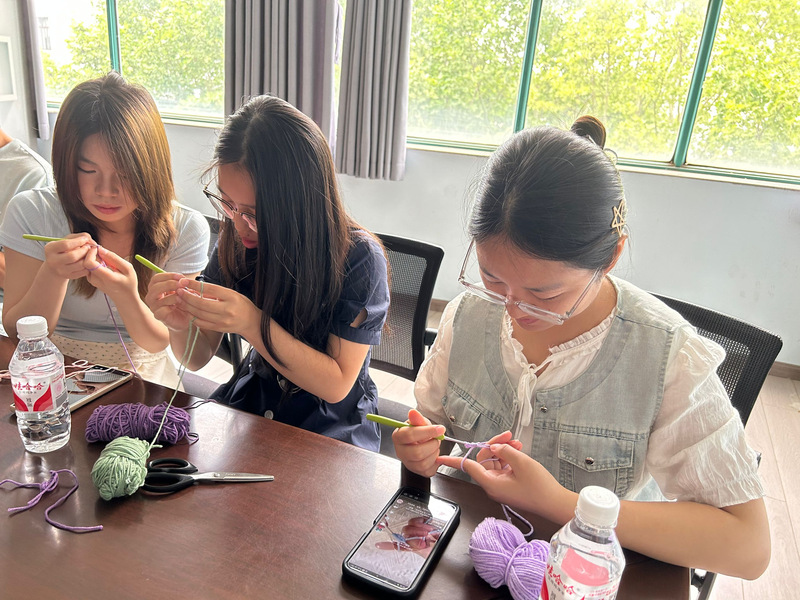 活动现场,舒缓的音乐与五彩斑斓的毛线相映成趣。同学们手中的钩针在毛线间灵活穿梭,有的初次尝试,虽动作生疏却乐在其中;有的技艺娴熟,快速完成精致的帽子和小花;还有的将创意融入作品,赋予钩织独特的艺术魅力。每一针一线都倾注了专注与耐心,大家在编织中体会到了宁静与成就感。