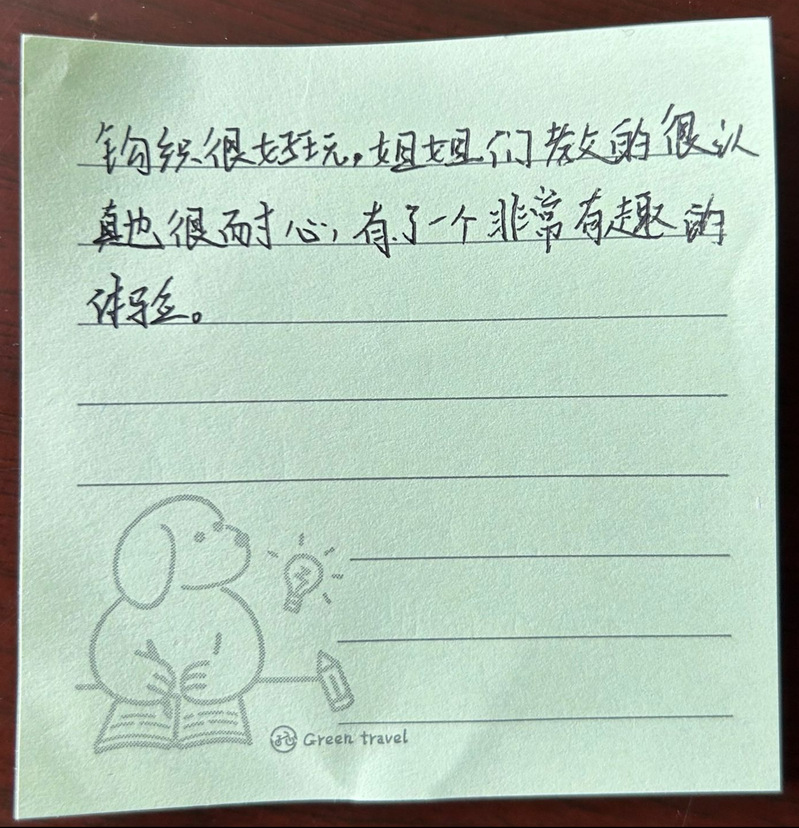 活动结束后,同学们纷纷写下感悟。有人表示:“钩织让我暂时忘却了学业压力,很解压。”也有人感叹:“虽然上手有些困难,但完成作品时的喜悦让人难忘。”这些真挚的文字,展现了活动对同学们心灵的抚慰与激励。